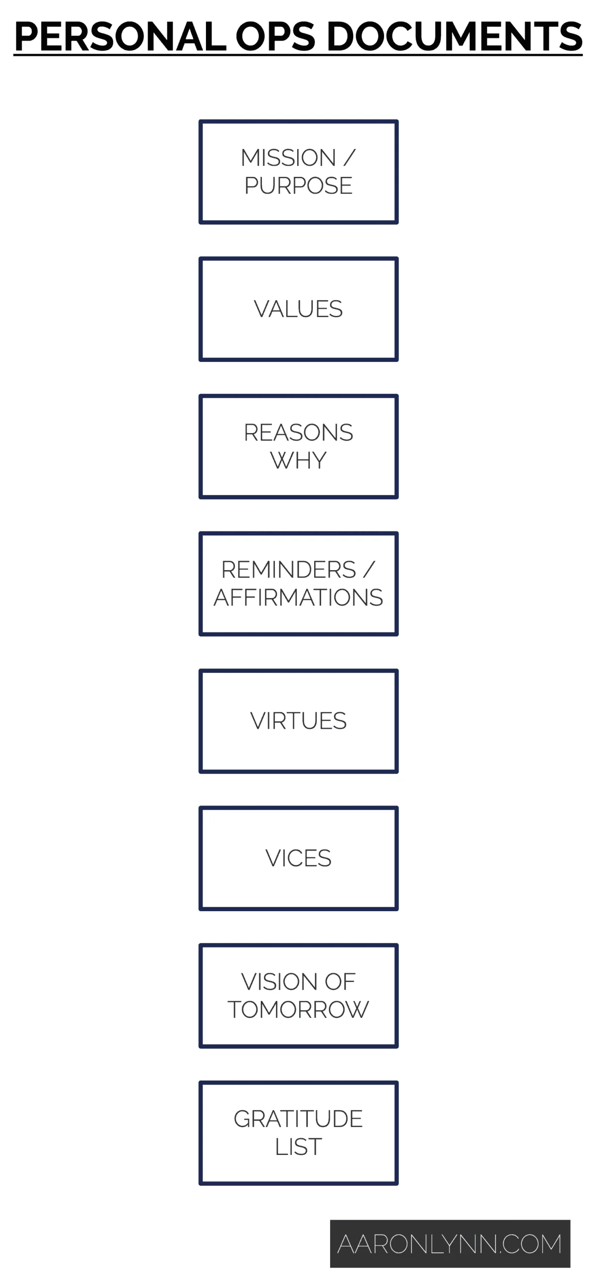 Your personal ops documents cover your mission, values, and identity (through reasons why, vision, virtues and vices, reminders and affirmations).
